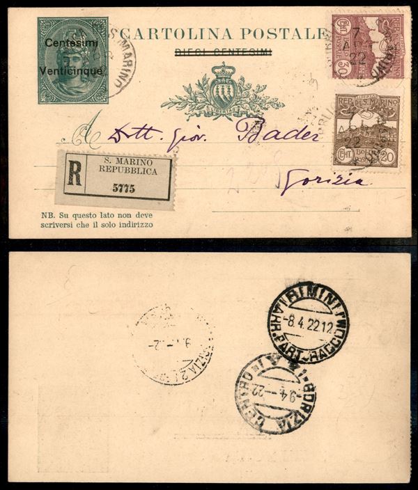 Cartolina postale da 25 cent su 10 (7) con complementari (73 + 75) raccomandata per Gorizia del 7.4.22
