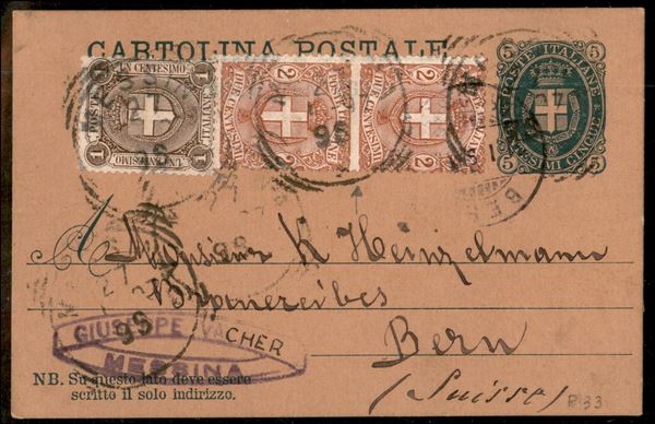 Cartolina postale da 5 cent Stemma (C11) tricolore con 1 cent (65) + coppia verticale del 2 cent (66d - dentellatura orizzontale spostata) da Messina 27.1.97 per Berna