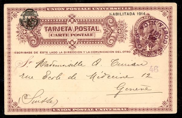 Cartolina postale "Tarjeta Postal" da 4 centesimi soprastampata Habilitada 1914 da San Jose 26.4.1917 per Ginevra (Svizzera)
