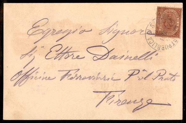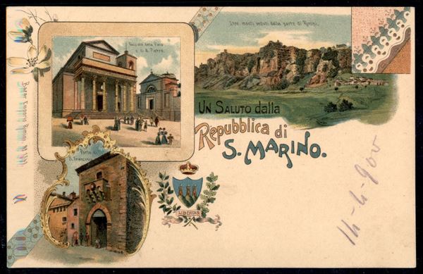 Cartolina "Un saluto da S. Marino" affrancata con 2 cent Cifra (28) da S. Marino 16 apr. (1900) per Firenze