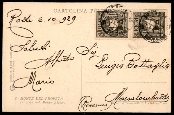 Coppia del 10 cent Pittorica (4) su cartolina da Rodi a Ravenna del 6.10.29