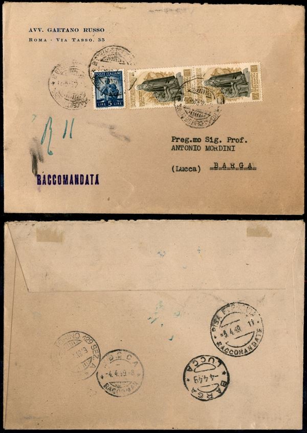 Coppia del 30 lire S. Caterina (577) + complementare (555) - raccomandata da Roma a Barga del 3.4.49