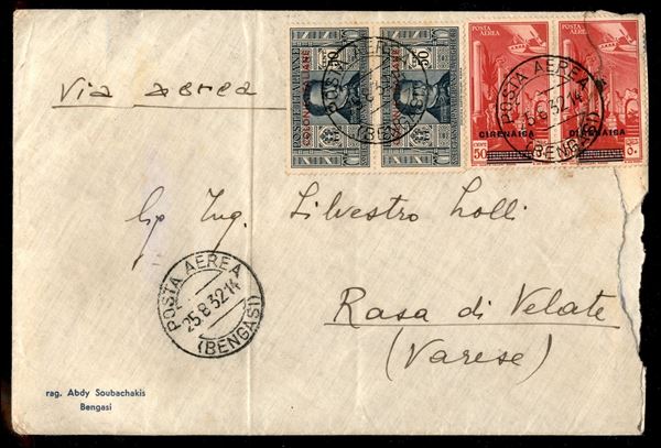 Coppia del 50 cent Leopardi (16) + coppia del 50 cent (4 Aerea Cirenaica) difettosa a destra - busta da Bengasi a Varese del 25.8.32