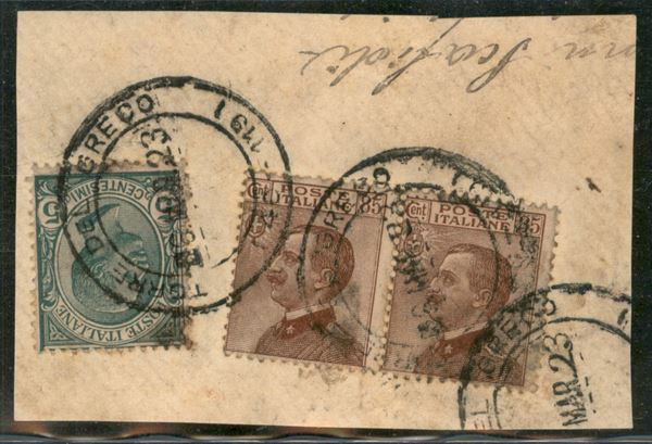 Coppia orizzontale del 85 cent Michetti (112) + 5 cent Leoni (81) usati su frammento - Torre del Greco 25 mar 1923
