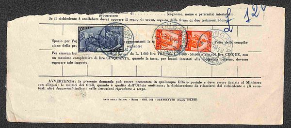 Duplicazione Buoni Fruttiferi - coppia 10 lire Democratica (559) + 100 lire Risorgimento (591) su parte di modulo - Longara 19.10.48