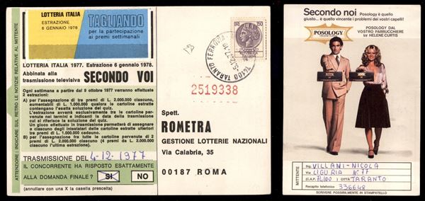 Falso per Posta - 150 lire (F 1083 A) isolato su cartolina da Taranto a Roma del 5.12.77 - cert. Diena (150)