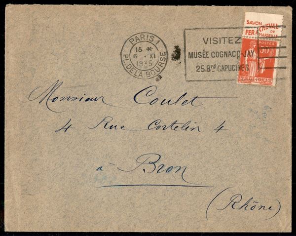 Fer a Cheval (Savon de Marseille) - 50 cent (276) con banda pubblicitaria su busta da Parigi a Bron del 6.11.1935
