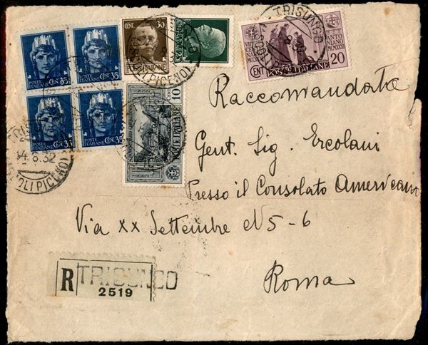 Frontespizio di raccomandata con affrancatura pentacolore composta da quattro 35 cent + un 30 cent + un 25 cent Imperiale + 20 cent Anno Santo + 10 cent Garibaldi (248/250 + 292 + 315) da Trisungo per Roma del 14.8.32