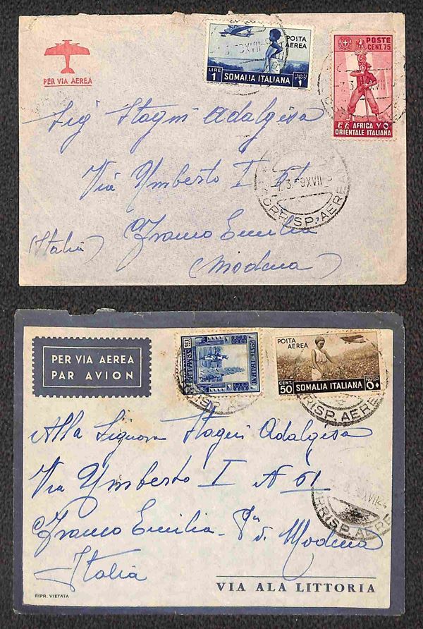 Gimma (P.ti 5) - due aereogrammi per Modena del 1939 con diverse affrancature (11 AOI + Somalia 21 Aerea - 223 + 18 Aerea Somalia)