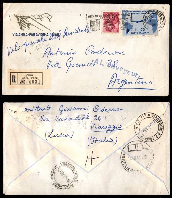 Gronchi (918 + complementare) - aerogramma raccomandato da Roma a Buenos Aires del 6.4.61