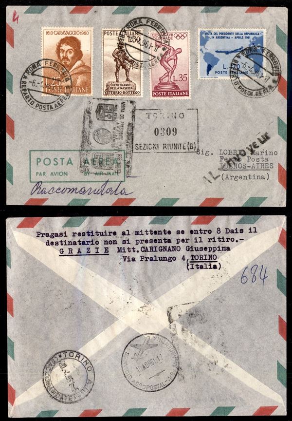 Gronchi (918 + complementari) - aerogramma raccomandato da Roma a Buenos Aires del 6.4.61