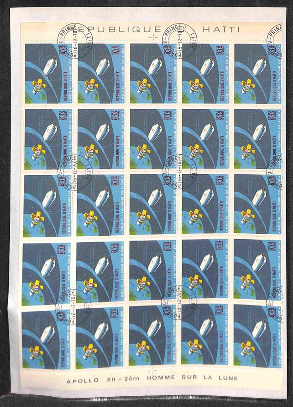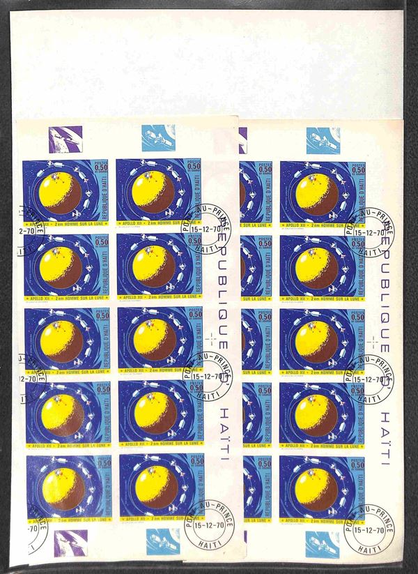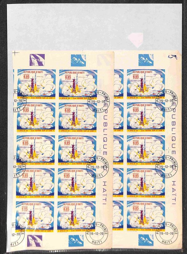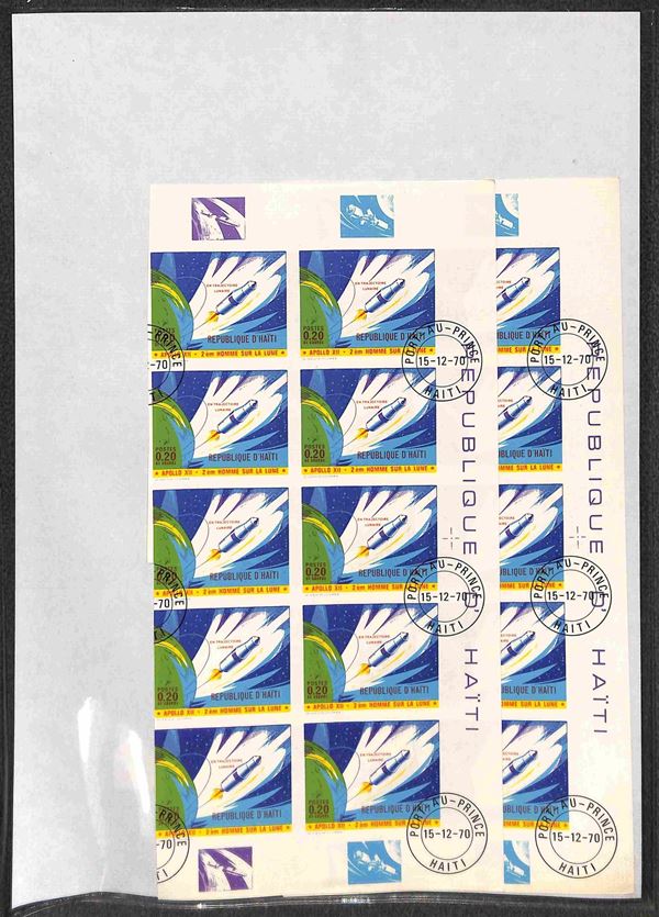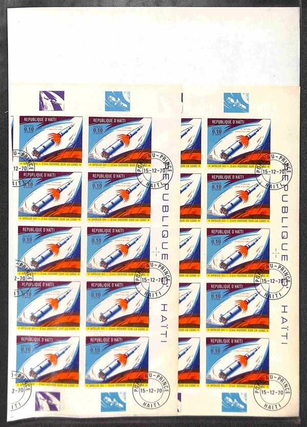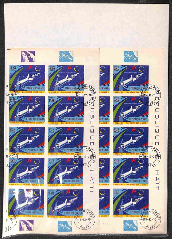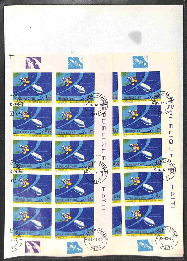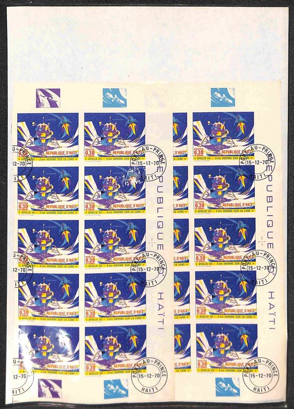 HAITI - 1970 - Apollo 12 (1116/1123) - 8 valori usati (15/12/70) - 15 cent dentellato in foglio intero di 25 pezzi - 7 valori non dentellati in due blocchi verticali di 10 ciascuno (20 per tipo) con bordi integri
