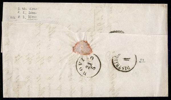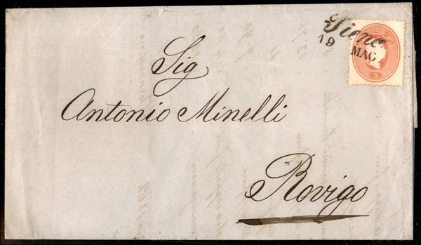 Lettera affrancata con 5 soldi (38) da Thiene 19 mag (1864) per Rovigo