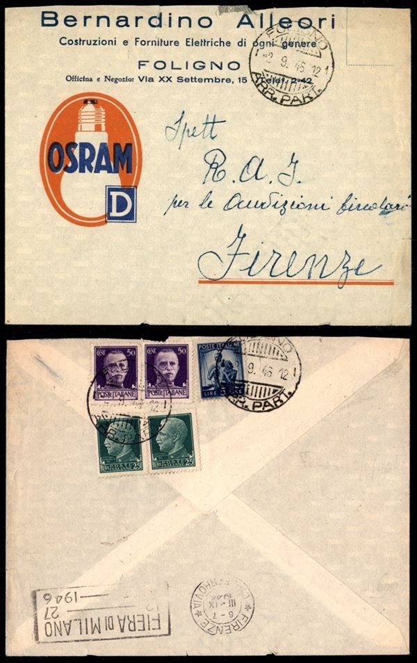 Mista Regno (248 coppia + 251 due) Democratica (555) al retro di busta pubblicitaria da Foligno a Firenze del 2.9.46