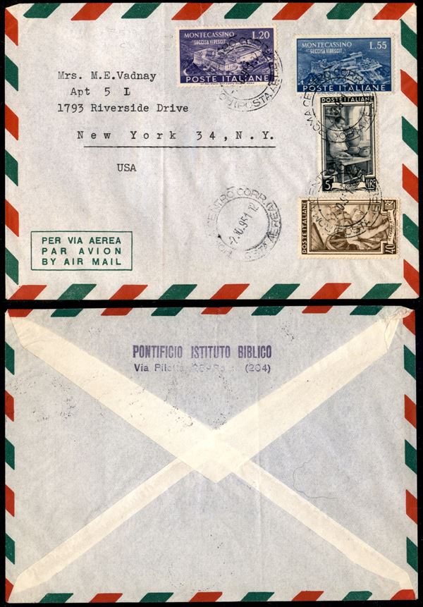 Montecassino (664/665) + complementari Lavoro (637 + 646) - aerogramma da Roma a New York del 2.10.51