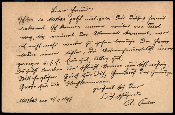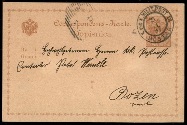 Mostar K. und K. Milit. Port 13 - cartolina postale per Bolzano del 21.11.1897