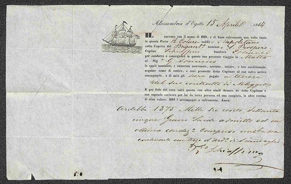 Nota di carico da Alessandria a Malta del 15.4.44 con tagli di disinfezione