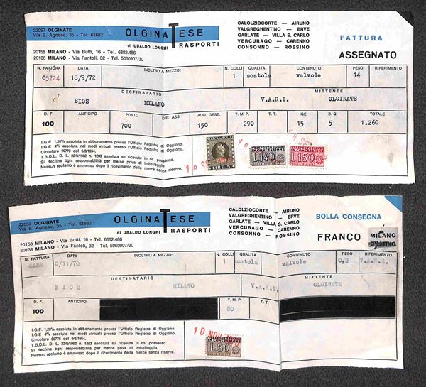 Pacchi in Concessione - due moduli da Milano a Olginate del 1970/1972 con diverse affrancature (una mista con Marca da Bollo)