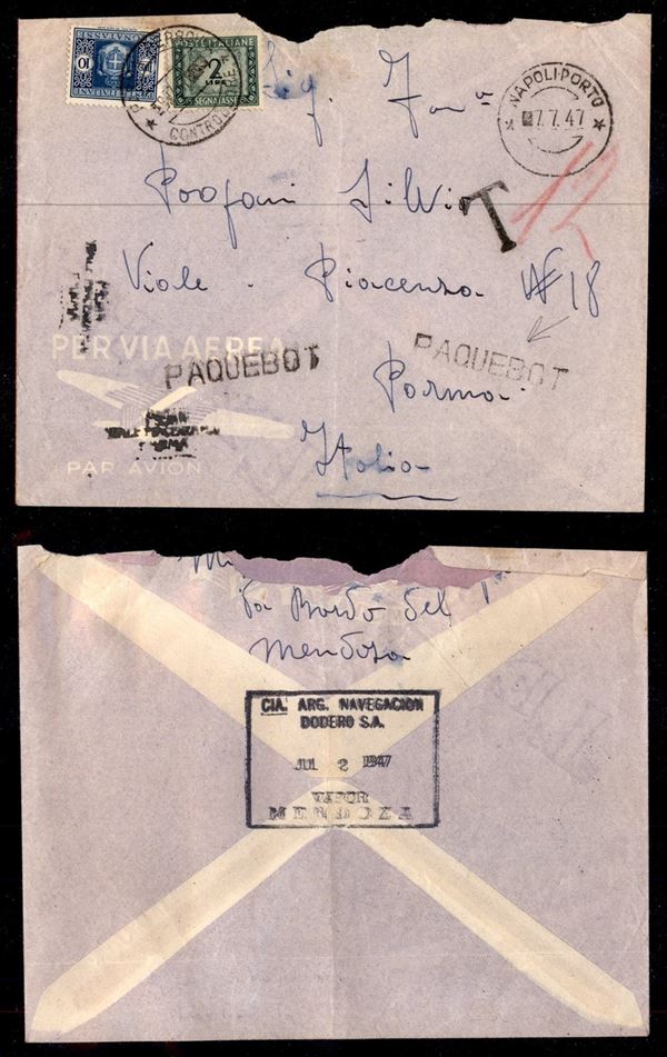 Paquebot - Busta spedita da bordo del Vapore Mendoza per Parma del 2.7.47 tassata in arrivo con Porto (84 + 94 Segnatasse)