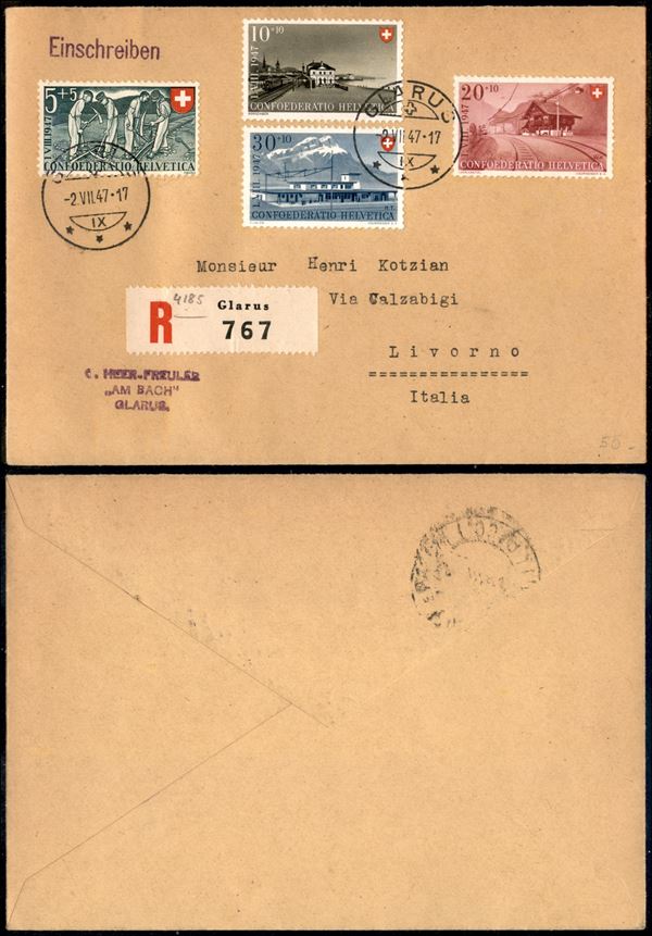 Pro Patria (480/483) - serie completa su raccomandata da Glarus a Livorno del 2.7.47