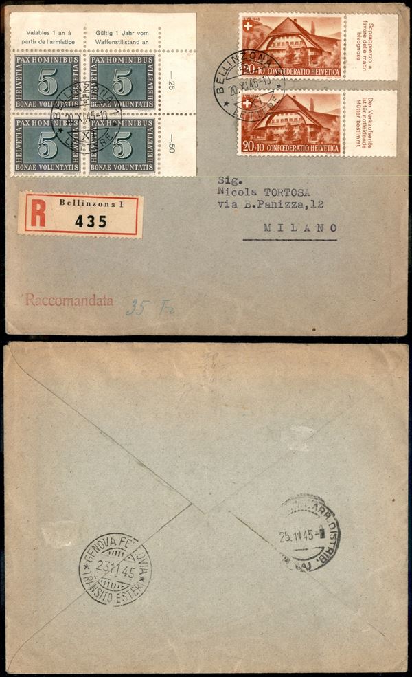 Quartina del 5 cent Pax (447) + due 20 cent Pro Juventute (462) - raccomandata da Bellinzona a Milano del 20.11.45
