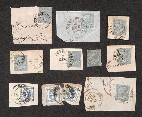 REGNO - 1863/1864 - 3 esemplari del 15 cent (12) + 8 esemplari del 15 cent (18) - tutti su frammenti con annulli Toscani del periodo - da esaminare