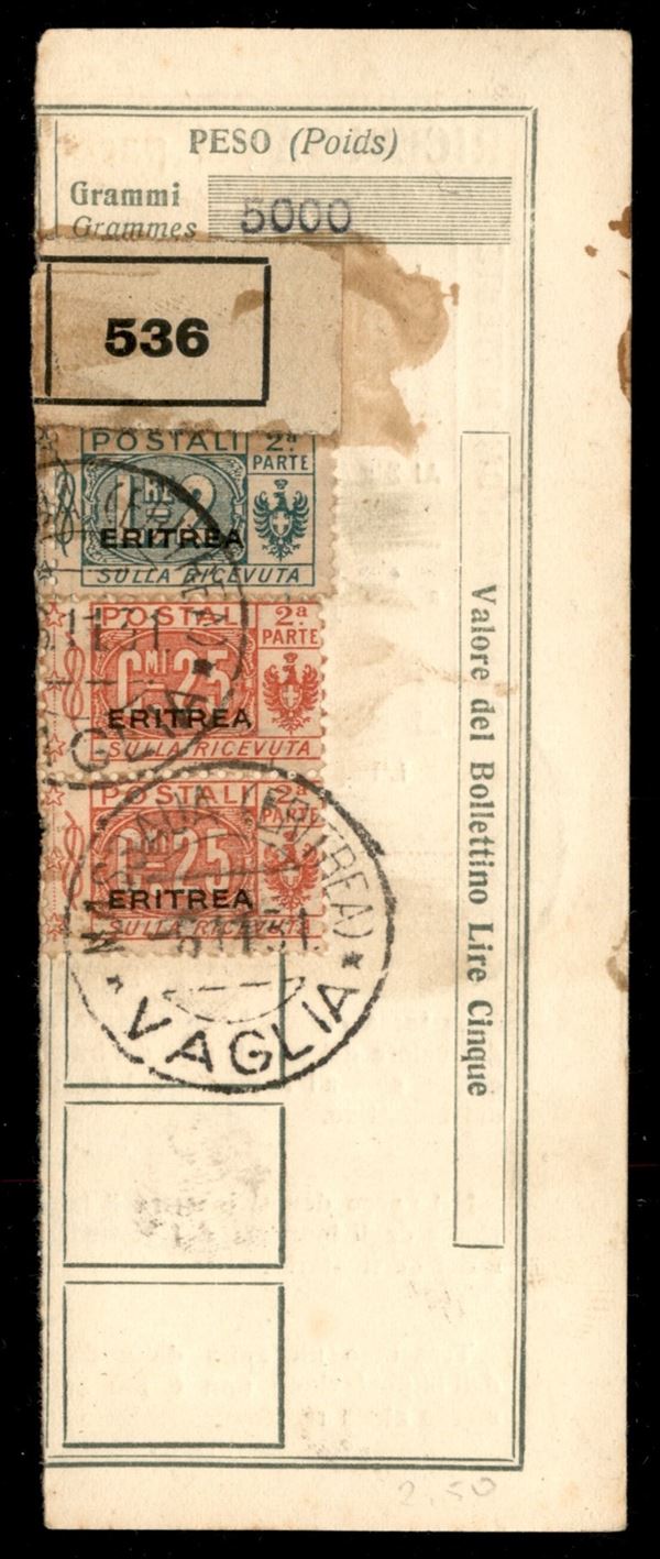 Ricevuta di bollettino da Massaua (Vaglia - P.ti 8) a Venezia del 6.11.31 con valori per Pacchi (metà destra - 12 coppia + 15)