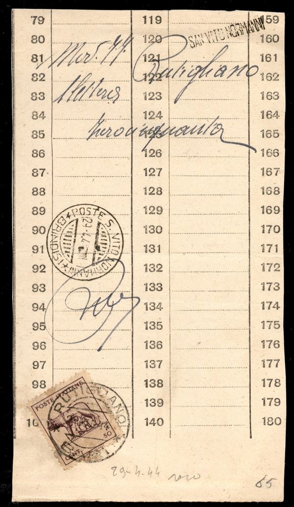 Ricevuta di pagamento di una lettera affrancata 50 cent Lupa (515) con annullo Rutigliano del 29.4.44 - a lato bollo guller + lineare San Vito Normanni - inusuale