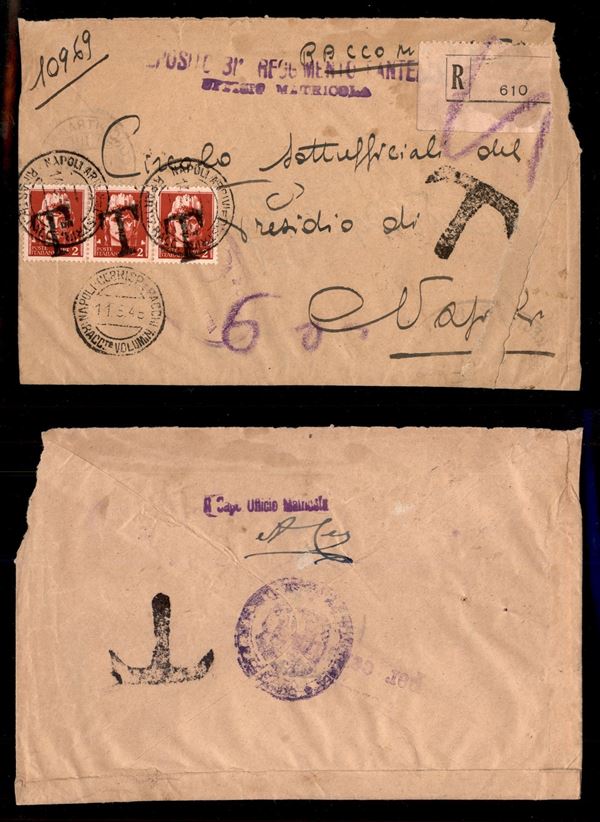 Striscia di 3 del 2 lire Imperiale (255) usata come tassa in arrivo a Napoli il 14.5.45 su raccomandata dalla P.M. - fori di spillo sul pezzo centrale