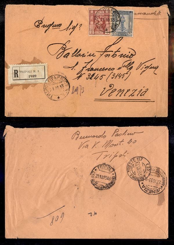 Tripoli d'Africa N. 3 (P.ti 10) - raccomandata per Venezia del 21.10.33 (43 + 49)