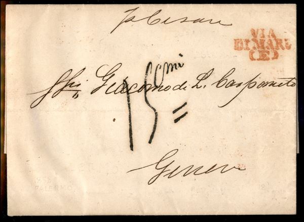 Via di Mare (E) in rosso + 15 cmi (tassa) - lettera da Palermo a Genova del 28.8.58