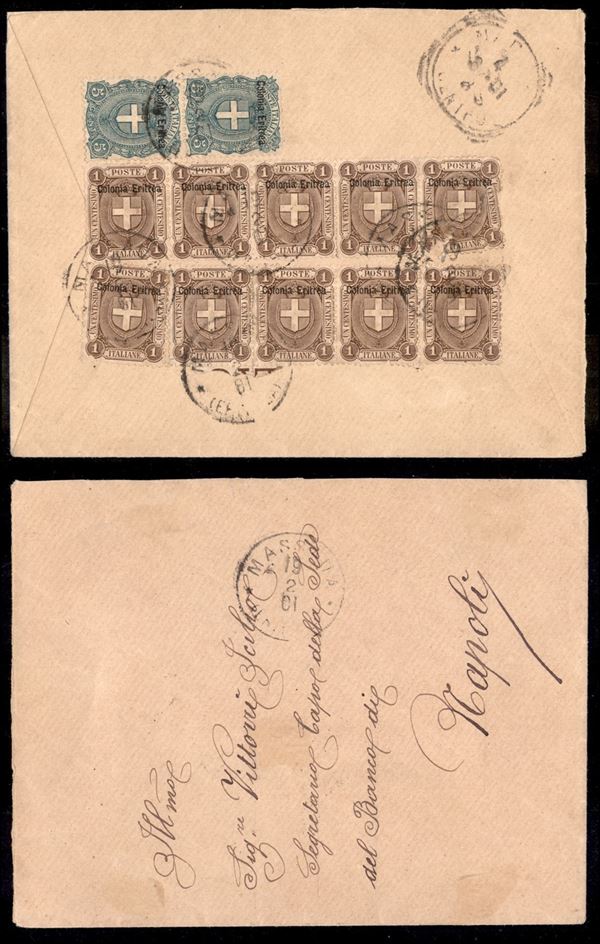 1 cent (12 - blocco di 10) + 5 cent (14 - coppia) al retro di busta da Massaua a Napoli del 19.2.01 - da esaminare