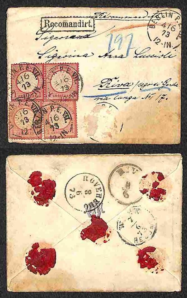 1 groschen (19) - coppia + due singoli (colori diversi) su bustina raccomandata da Berlino a Riva del Garda del 4.6.73 - affrancatura carente (un valore asportato)