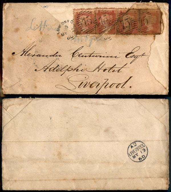 1 penny (40 Stanley Gibbons) - striscia orizzontale di 4 (con dentellatura orizzontale obliqua) a chiudilettera su busta da Londra a Liverpool del 12.5.60 - tre pezzi strappati e ossidati - One Penny in alto sul primo pezzo (perfetto)