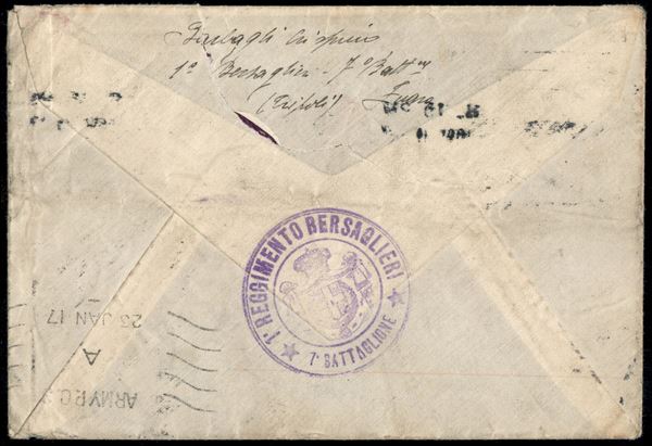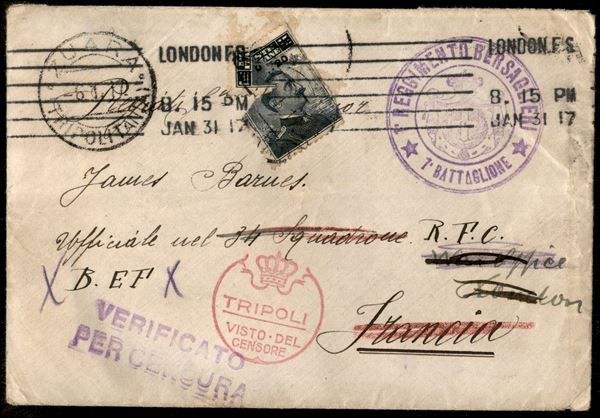 1° Reggimento Bersaglieri/1° Battaglione (viola) + censure - busta da Zuara per la Francia del 6.1.17 inoltrata a Londra - completa di testo - affrancatura difettosa