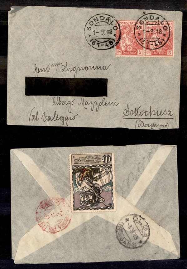 10 cent + 5 Croce Rossa (102) - coppia su busta per Bergamo del 1.9.18 - indirizzo in parte cancellato