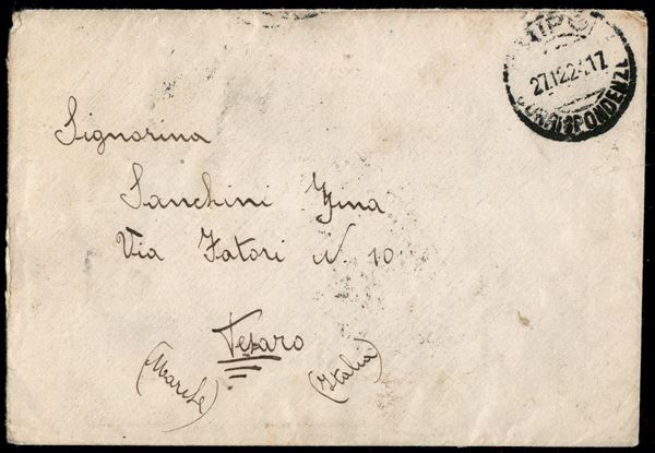 10 cent Pittorica (47) - blocco di 8 al retro di busta da Tripoli a Pesaro del 27.12.24