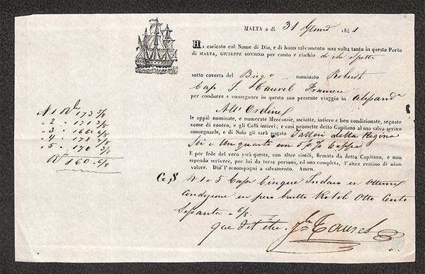 1841 – Ricevuta di carico per trasporto marittimo – molto bella e fresca