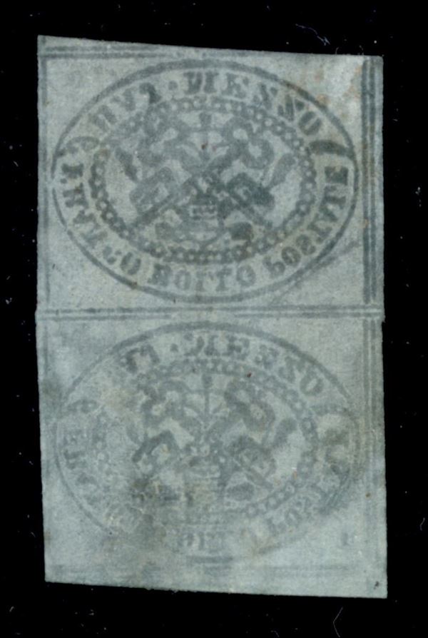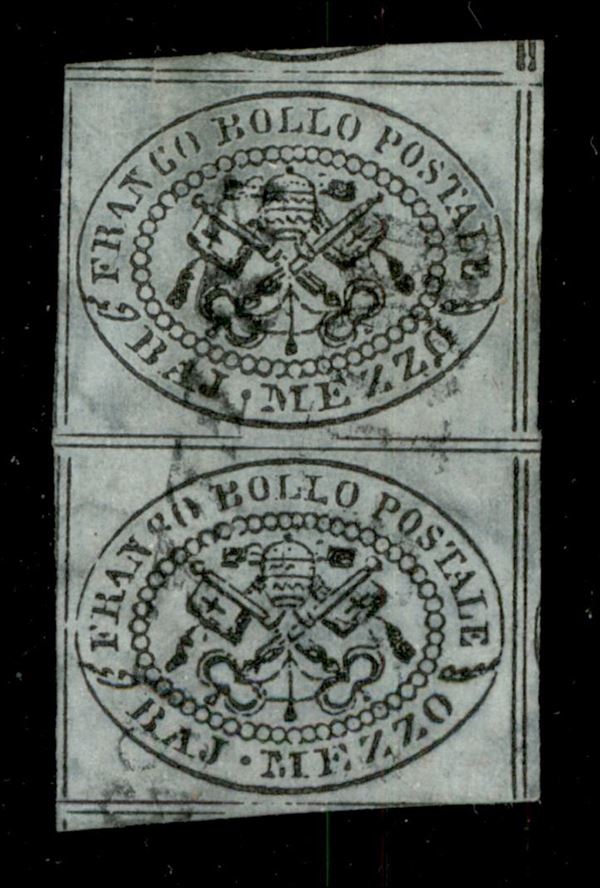 1852 - Mezzo bai (1a - decalco oleoso) - coppia verticale usata a Bologna - parte di 5 vicini (375++)