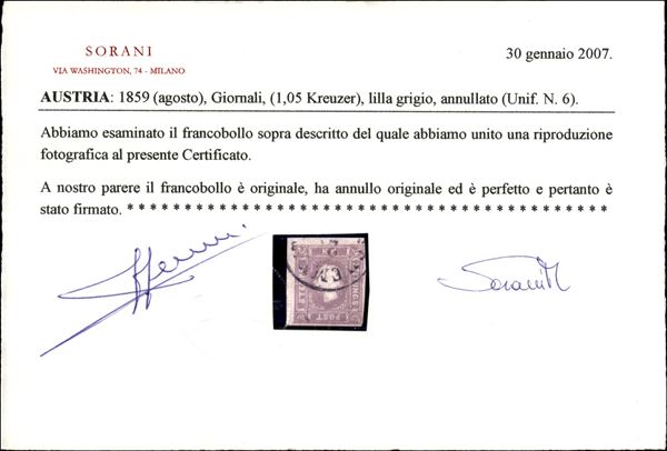 1858 - 1,05 kreuzer (17) usato - Raybaudi + cert. Sorani