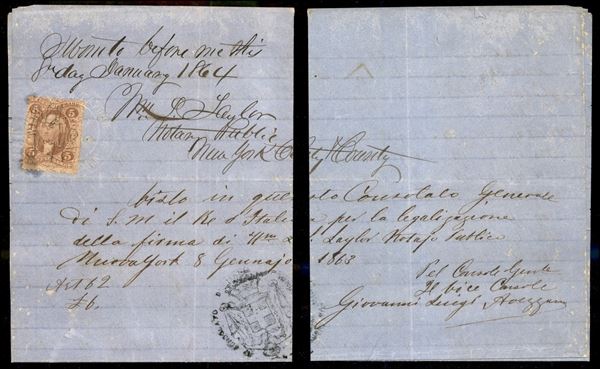 1863 (8 gennaio) – R. Consolato d'Italia – 5 cent Fiscale su documento d'autentica
