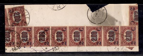 1875 - 2 cent su 2 lire (34) - striscia verticale applicata a cavallo (strappata con l’uso) - testatina di piego da Ponte nelle Alpi del 22.1.79 (400 la striscia di 6 usata)