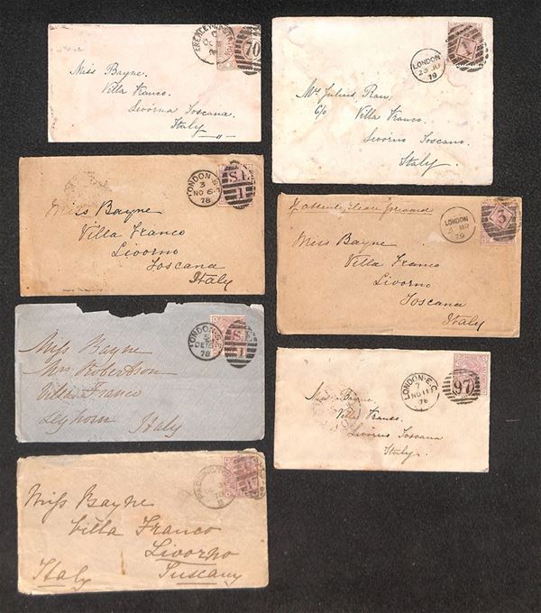 1878/1879 – Sette bustine tutte affrancate con il 2 ½ pence (56) indirizzate a Livorno – da esaminare