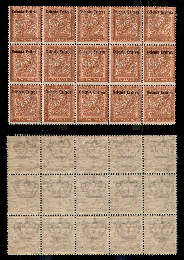 1893 - 2 cent Torino (2) - blocco di 15 - gomma integra (300+)