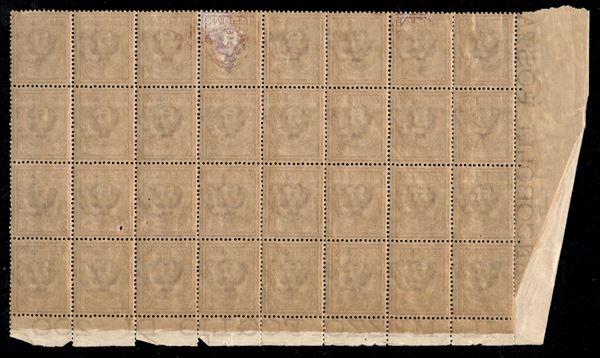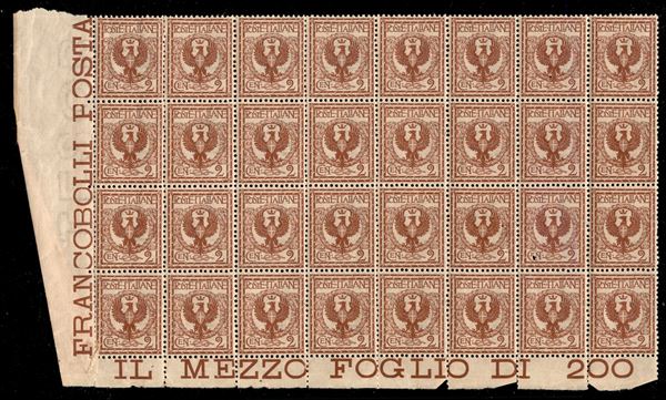 1901 - 2 cent Floreale (69) - blocco angolare di 32 - gomma integra - tutti ottimamente centrati - quattro pezzi difettosi (1.600++)