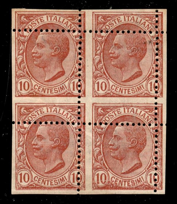 1906 - 10 cent Leoni (82nd) con dentellature spostate in basso a sinistra - blocco ritagliato a quartina con le forbici - gomma originale - Oliva