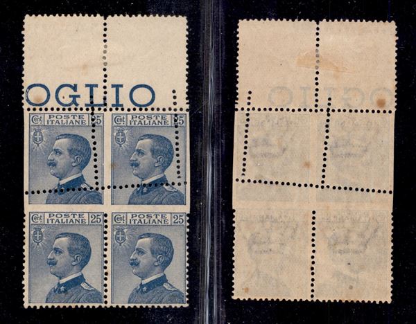 1908 - 25 cent Michetti (83 lf) - blocco bordo foglio con interspazio - pettine centrale spostato e obliquo - gomma integra