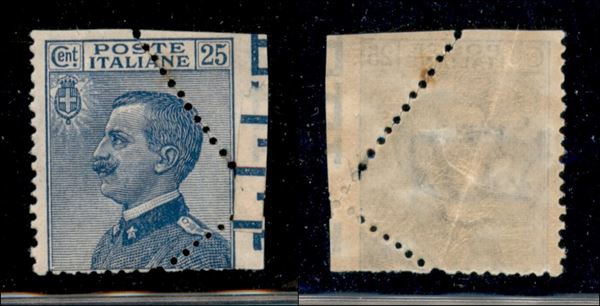 1908 - 25 cent Michetti (83 varietà nd) - dentellatura destra ruotata (per piega del foglio) parzialmente aperta (riparata applicando striscia bordo foglio al recto sulla destra) - gomma integra