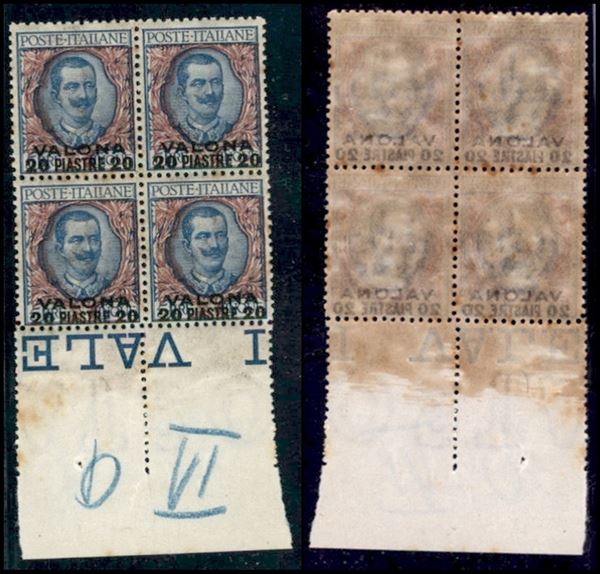 1909 - 20 piastre su 5 lire (7) - quartina bordo foglio - gomma integra - ottimamente centrata (700++)
