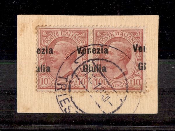 1918 - 10 cent (22eb) con soprastampa a cavallo - coppia usata su frammento